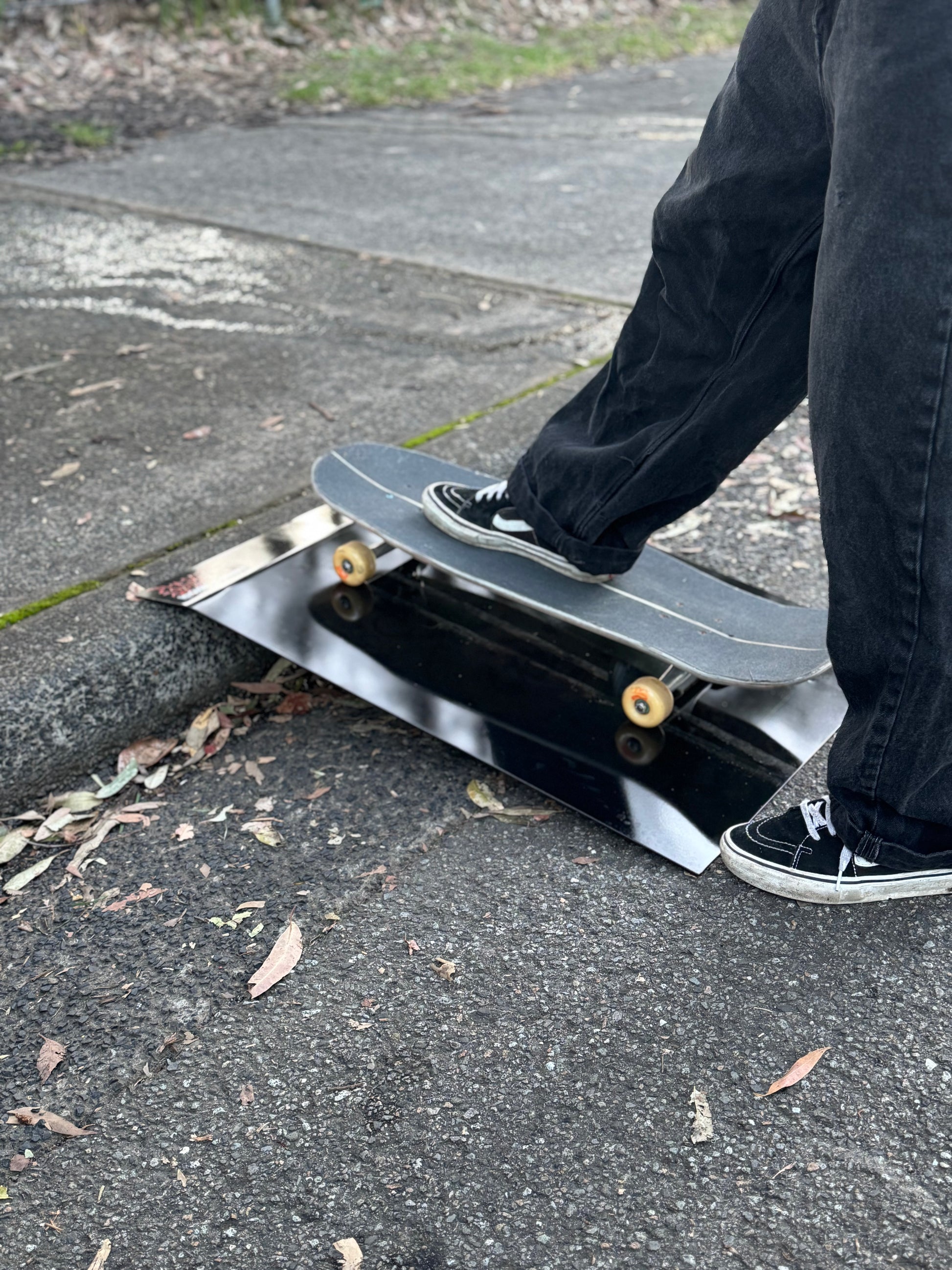 Made to help skaters or filmers get up curbs with ease, the Curb Assist is crafted from tough 3mm Australian steel. It features a smooth fold that sits clean on top of standard curbs and two solid brackets underneath to keep it strong and stable. Whether you're rolling up for a trick or chasing a line with the camera, this ramp's built to back you up.